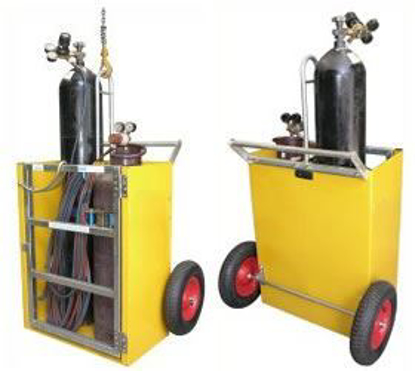 This gas cylinder trolley has been designed to suit one type "G" Oxygen (Oxy) gas cylinder and one type "G" Acetylene gas bottle. Provision has also been made to house all hoses inside the trolley. Supplied with an internal load binder to securely fasten both cylinders/bottles to the trolley. Fitted with both a Handle and a crane lifting point and dual 400mm diameter air inflated rubber wheels, this cage can be easily transported manually or by crane.