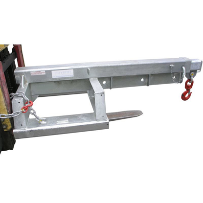 Converts forklift into a mobile crane in seconds. Adjustable along the length of the fork. Secured to forks by thumb screw. Swivel hook with safety latch.